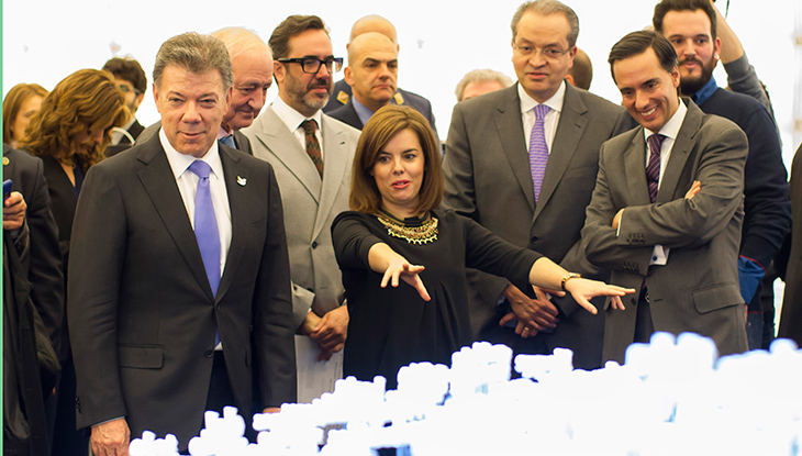 De izda. a dcha. el presidente de Colombia, Juan Manuel Santos; Emilio Gilolmo, vicepte. de Fundación Telefónica, Soraya Sáenz de Santamaría, vicepresidenta del Gobierno de España, Fernando Carrillo, embajador de Colombia y Alfonso Gómez, presidente de Telefónica Colombia.